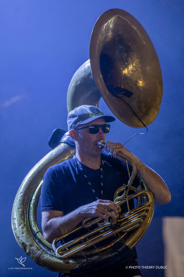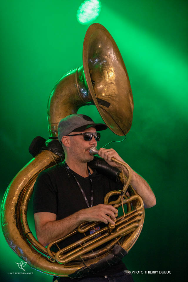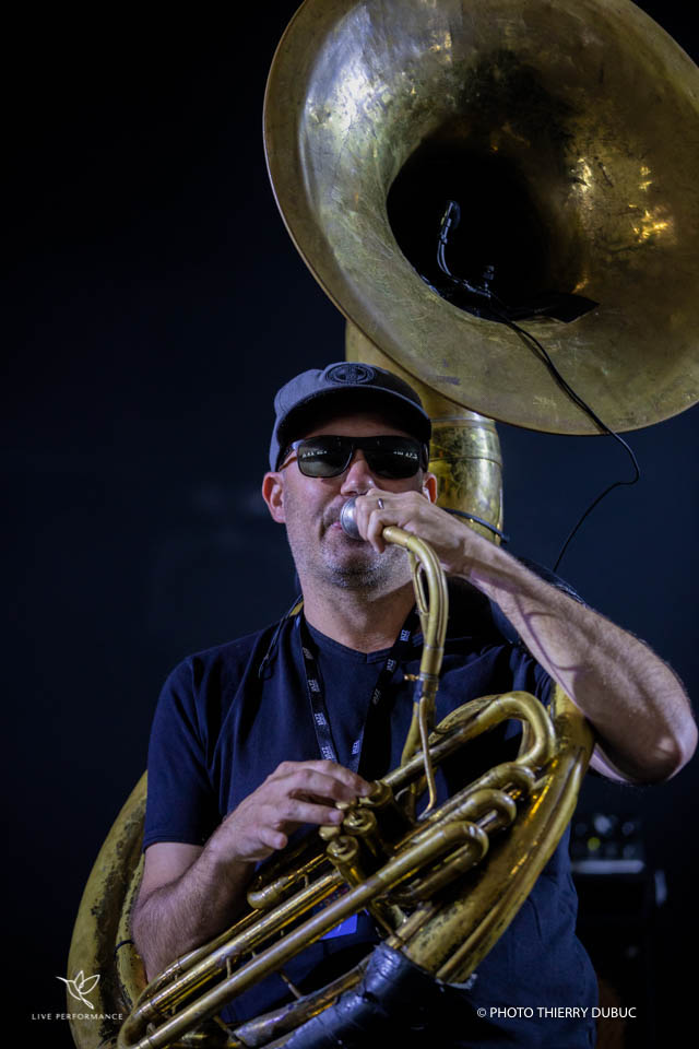 Rafgee, au soubassophone (ou sousaphone) lui, est le son brut et chaud qui fait marcher même les paumes, au pas de l’espoir ! Il tient souvent des notes basses en continuum comme un vrombissement d’éléphant qui secoue le ventre ou bien des scansions bougonnes, granuleuses, avec en filigrane des rythmes amérindiens très charnels, les pieds dans la terre, les poings serrés et la tête dans le ciel étoilé. Un gros cœur qui bat, un crapaud puissant qui vrombit.